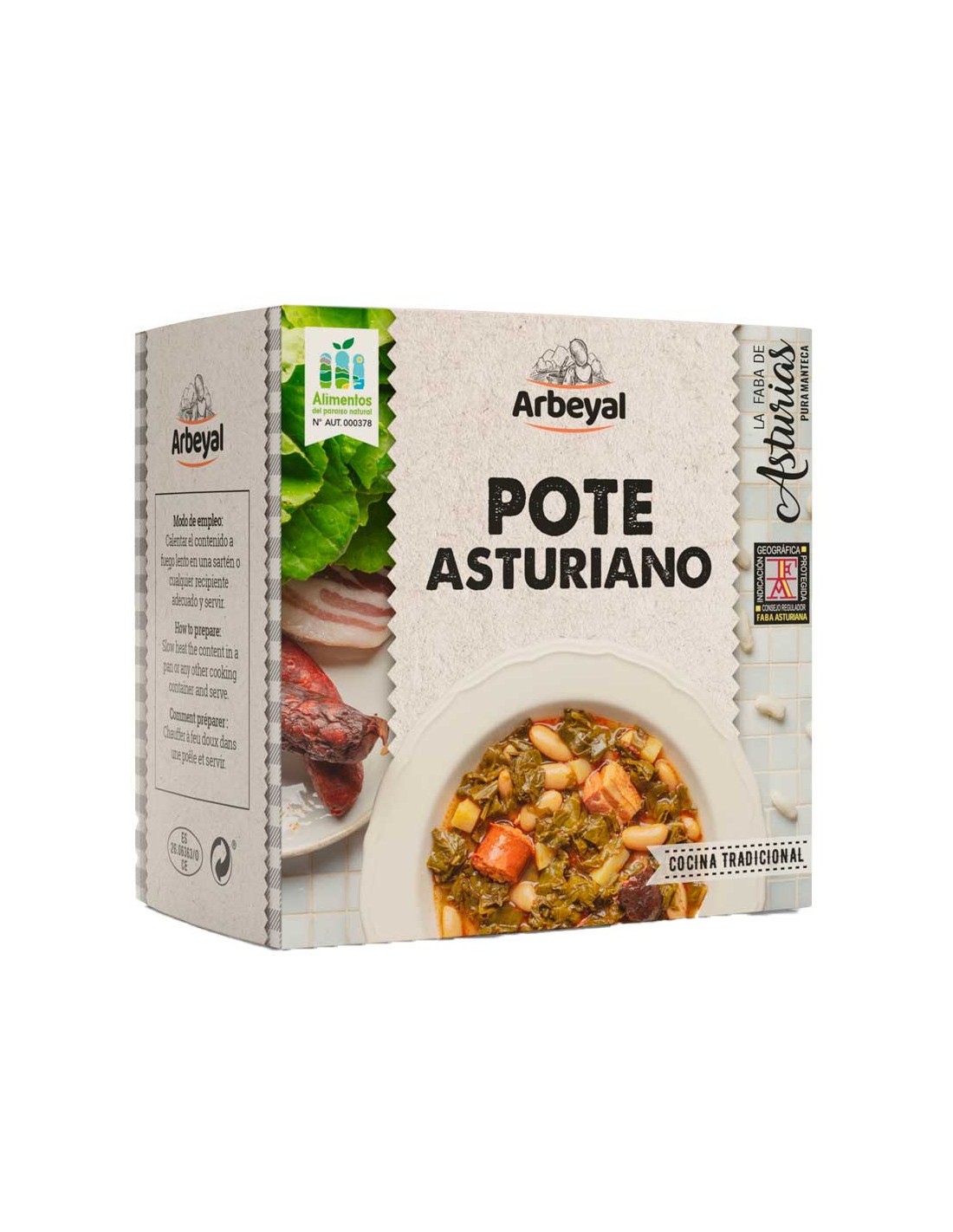 Berza (20%), faba asturiana IGP (15%), agua de cocción, chorizo asturiano ahumado (8%) (magro de cerdo, papada de cerdo, tripa natural de cerdo, pimentón, ajo y sal), morcilla asturiana ahumada (8%) (tocino de cerdo, cebolla, sangre de cerdo, tripa natural de cerdo, pimentón y sal), panceta (8%) (panceta y sal), patata (5%), aceite de oliva, sal y pimentón.