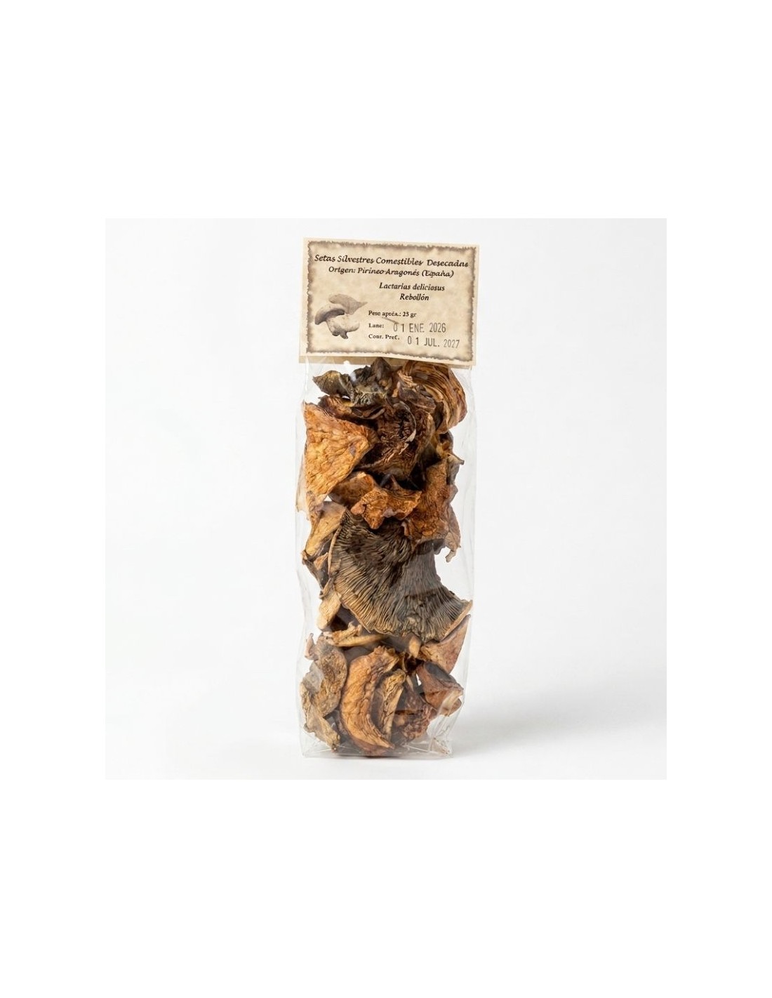 El robellón deshidratado de Castejón de Sos es una seta silvestre del Pirineo aragonés (Lactarius deliciosus), deshidratada para conservar su sabor intenso y ligeramente resinoso. Tras rehidratarse, es ideal para guisos, arroces y salteados, aportando un toque tradicional y aromático.