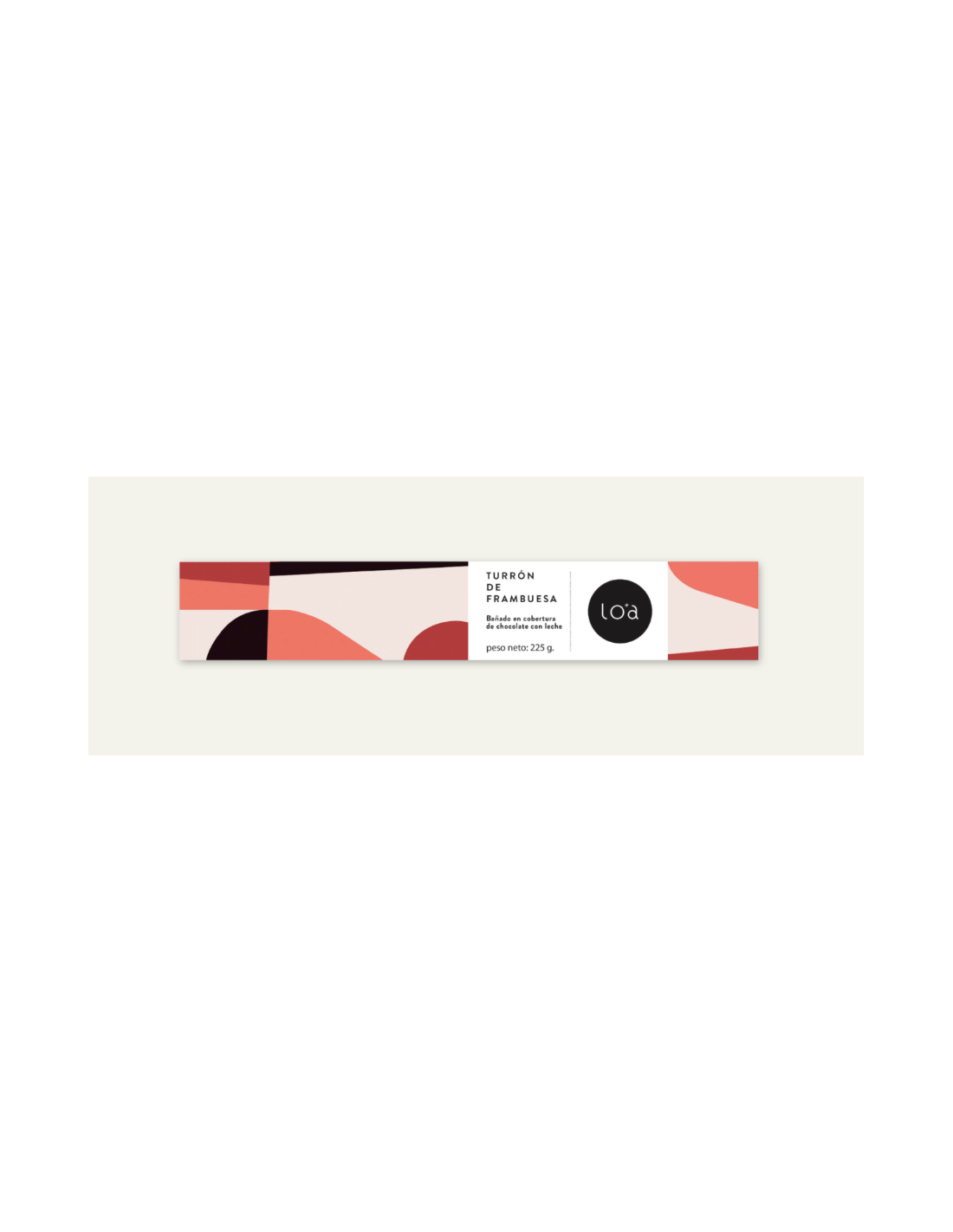 Turrón Loa de frambuesa.Ingredientes: cobertura de chocolate, nata, puré de frambuesa, azúcar, cobertura de chocolate con leche, mantequilla, licor de fresa, glucosa, aromas de fresa, aroma ron blanco, espesante, acidulaste y frambuesa.Tableta de 240grs.Elaborado por Pastelería Loa en Huesca.